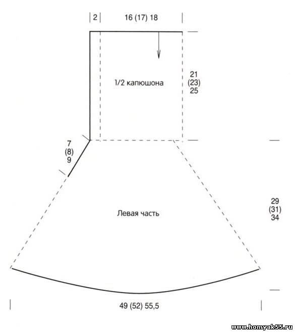 Вяжется целиком, начиная с капюшона: для этого на круговые спицы набрать 39 (41) 45 петель и вязать между кром. жемчужным узором, при этом первые и последние 2 петли (петли планок) и кром. вязать платочной вязкой. Через 21 (23) 25 см от наборного края связать между кром 2 ряда платочной вязкой, затем вязать лиц. гладью, при этом петли планок и кром. вязать платочной вязкой и в 1-м ряду убавить 3 (3) 7 петель (но только не на петлях планок). Одновременно в 1-м ряду протянуть 4 нити контрастного цвета: 1-ю нить после 4-й петли, 2-ю - после 14-й (15-й) 15-й петлм, 3-ю - после 22-й (23-й) 23-й петли и 4-ю - после 32-й (34-й) 34-й п.етли и в каждом 2-м ряду после 1-й нити, перед 2-й нитью, после 3-й нити, перед 4-й нитью прибавить 18 (19) 21 х 1 петле, как описано выше = 108 (114) 122 петель. Одновременно через 28 (31) 34 см от наборного края вязать на всех петлях лиц. гладью круговыми рядами. Через 24 (25) 28 см от капюшона (после прибавлений) связать еще 1 круг ряд лиц. гладью, 6 (8) 8 круг ряд жемчужным узором и 1 круг ряд лиц гладью. После этого петли закрыть. (Длина пончо без капюшона = 29 (31)34 см.