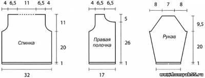 Вязать симметрично правой полочке, выполнив 4 отверстия для пуговиц перед последними 3 петлями след. образом: 1-е отверстие на высоте 3 см от нижнего края, остальные на расстоянии 4,5 см друг от друга.Рукав