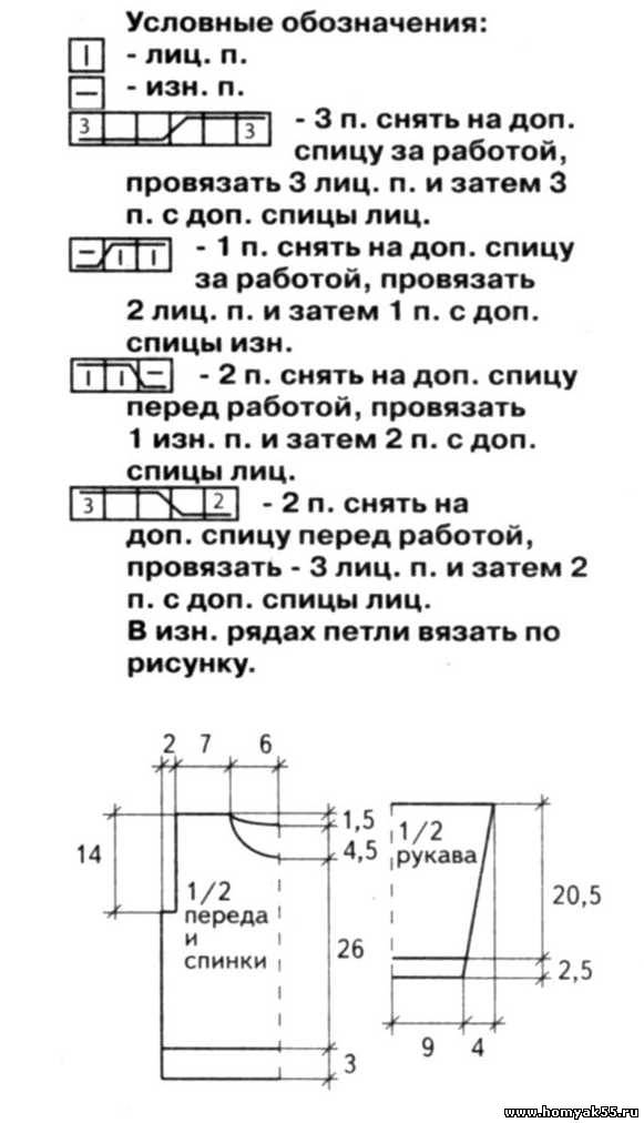 На спицы № 2,5 наберите 69 петель$CUT$ (67 петель + 2 кром. петли) и вяжите 3 см резинкой 1 х 1. Затем поменяйте спицы на № 3 и вяжите следующим образом; 1 кром. петля, 9 петель изн. глади, 6 петель узора 1, 4 петли изн. глади, 29 петель узором 2, 4 петли изн. глади, 6 петель узора 1, 9 петель изн. глади, 1 кром. петля. На высоте 22 см от нижнего края изделия закройте для пройм с обеих сторон по 5 петель = 95 петель и вяжите прямо.На высоте 29 см от нижнего края изделия для выреза горловины закройте центральные 13 петель и далее каждую сторону вяжите отдельно. Для закругления горловины с внутренней стороны закройте в каждом 2-м ряду 1 раз х 3 петли, 1 раз х 2 петли и 1 раз х 1 петлю. На общей высоте 35 см закройте оставшиеся 17 петель. Другую сторону горловины довяжите симметрично.