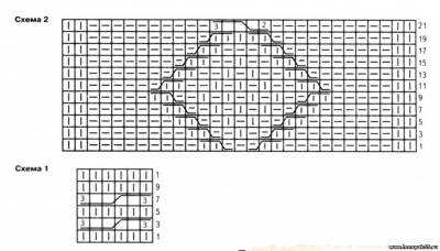 Узор 2: вяжите по схеме 2. На схеме приведены только лиц. ряды, в изн. рядах все петли вяжите по рисунку.