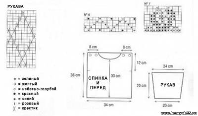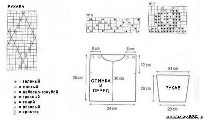 Выполнить боковые швы, оставив отверстия для вшивания рукавов. Выполнить швы рукавов, вшить рукава. Низ рукавов и низ пуловера обвязать 1 рядом СБН синей нитью. На незашитых отрезках плеча спинки сделать петельку для пуговицы. На плечах застегивается только 1 пуговица; еще 2 пуговицы служат украшением (см. модель). На планках горловины зеленой нитью вышить зигзагообразный узор из 4 петель. Между зубчиками зигзага красной нитью вышить узелки.