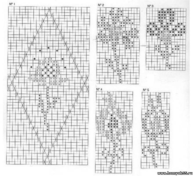 Вышивка: вышить узор крестиком (1 крестик на 1 вязаной петле) или швом «петля». Цветы можно связать жаккардовым узором (при смене цвета перекрещивать нити на изнаночной стороне работы).