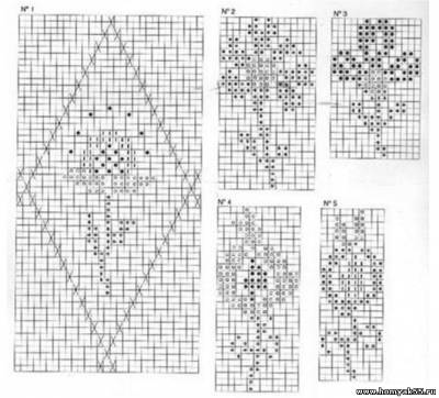 Только на переде и рукавах. На бумаге в клетку (необходима для вязания жаккарда или вышивки) нарисовать ромбы, начав с центра вязания (= всего 78 петель), каждая петля равна 1 вышитой петле. У ромбов по всем углам 1 общая петля с соседними ромбами. Этот рисунок очень облегчит его перенос на вязаную деталь при помощи вышивки (см. модель). Вышив все ромбы сложенной вдвое зеленой нитью, вышить цветочек в центре каждого ромба или другие рисунки по вкусу. После вышивки вновь отутюжить детали с изнанки, просто приставляя утюг и не передвигая его.