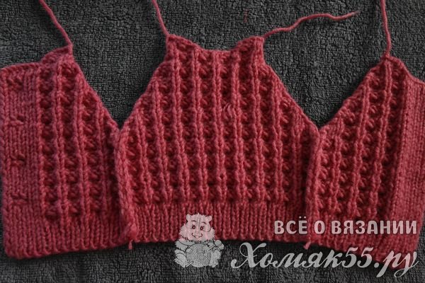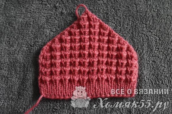 2 ряд: 1 кром.,* 2 лиц., 2 изн., 2 изн. провязанные вместе * повторять от (*), 1 кром.