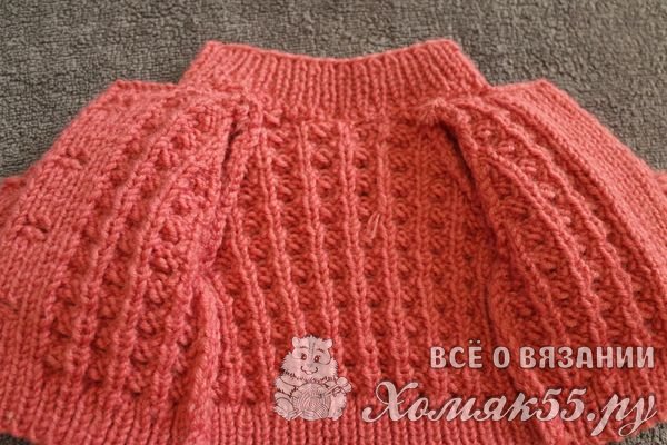 Провязав примерно 10 сантиметров, начинаем убавлять петли для проймы реглан. Для этого в каждом новом ряду следует убавлять по 1 петли (т.е. провязывать их вместе) с обеих сторон. Провязав еще 10 сантиметров закрыть оба плечика раздельно, предварительно оформив окат горловины.