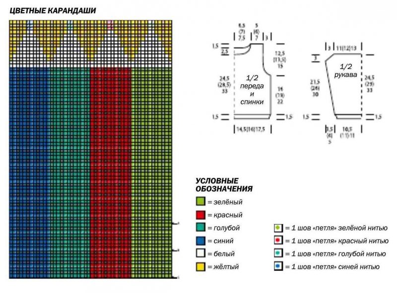 Вышить кончики цветных карандашей швом «петля». Выполнить плечевые швы. На чулочные спицы перевести отложенные 26 (28) 30 петель спинки, 14 (16) 18 петель выреза переда, между ними набрать 2 х 28 петель, связать 1,5 см = 6 круг. рядов резинкой и все петли закрыть по рисунку. Втачать рукава. Выполнить боковые швы и швы рукавов.