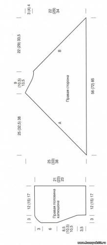 Выполнить задний средний шов (А). Выполнить передний средний шов (В), при этом верхние 7 см оставить открытыми для шлицы. Выполнить задний шов капюшона и пришить капюшон к вырезу. По краям шлицы и по переднему краю капюшона набрать на круг. спицы 96 (104) 104 петли фиолетовой нитью и связать 2 см платочной вязкой. Короткие стороны планок положить правую на левую и пришить. Ложные карманы пришить наискосок. Ярко-розовой нитью выполнить 2 шнурка с кисточками длиной 20 см и пришить их спереди на концах выреза.Выкройка