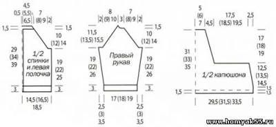 Планку капюшона отвернуть вовнутрь и пришить (кулиска). Выполнить задний шов капюшона. Капюшон втачать в вырез горловины. Для планок застёжки - молнии набрать белой нитью по 4 петли и связать 32 (37) 42 см лиц. гладью. Петли закрыть. К передним краям полочек притачать застёжку - молнию. Планки застёжки - молнии пришить на изнаночную сторону. Изготовить белый шнур длиной 100 см и протянуть его через кулиску капюшона.