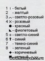 Нитью светло-голубого цвета набрать 62 петли и вязать 10 рядов плат. вязкой и 2 ряда лиц. гладью. Дале вязать лиц. гладью 2 ряда и в середине детали начать вывязывать мотив по схеме. Закончив выполнение мотива, перейти на нить голубого цвета.
