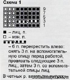 Нитью светло-голубого цвета набрать 41 петлю и вязать 10 рядов плат. вязкой. Далее перейти на нить белого цвета и выполнять узор по схеме 1. Для скосов прибавить с обеих сторон 10 раз по 1 петле в каждом 5-м ряду. На высоте 25 см закрыть петли.