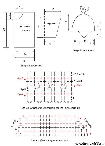 Вяжите шапочку снизу вверх прямым полотном. Начните вязание по схеме основного полота жакета. Рассчитайте длину начальной цепочки по размеру окружности головы 44-46 см. Высота прямого полотна 9-10 см. Продолжите вязание меланжевой нитью, таким же полотном, как на штанишках. Вяжите с прибавками в рядах из ССН в 12 местах.Когда останется 8 - 10 петель, свяжите еще 2 ряда столбиками с 2-3 накидами, провязывая в каждом ряду по 2 столбика в 1 петлю. Получившийся гребешок обвяжите по краю 1 рядом из СБН нитками цвета «Б» и закончите "рачьим шагом". Сделайте шов на затылке. Довяжите уши СБН в прямом и обратном направлениях меланжевой нитью. У затылка делайте прибавки в каждом ряду, провязывая по 2 СБН вместе, а с противоположной стороны делайте убавки через ряд.