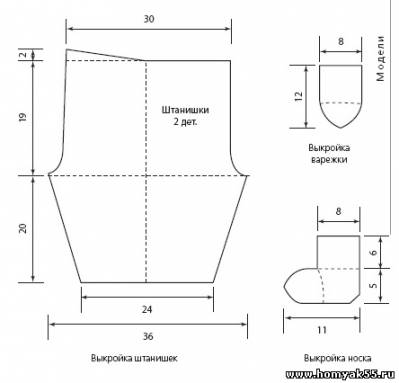 Вяжите штанишки по выкройке из двух симметричных деталей. Детали вяжите снизу вверх, чередуя два ряда. Лиц. ряды вяжите ССН, а изн. ряды вяжите СБН. Для вязания штанишек составьте меланж: 3 нити цвета «Б» и одна нить цвета «В». Готовые летали отпарьте с изнанки и соедините по швам. Обвяжите нижний край штанишек 1 рядом из СБН нитками цвета «Б».Отделайте край "рачьим шагом". Обвяжите верхний край штанишек двумя-тремя рядами из ССН, на высоту пояса. Довяжите подгиб пояса рядами «сетки». Ряды не замыкайте в круг полустолбиком. Зашейте в круг широкую резинку. Подшейте с изнанки подгиб пояса вокруг замкнутой резинки.