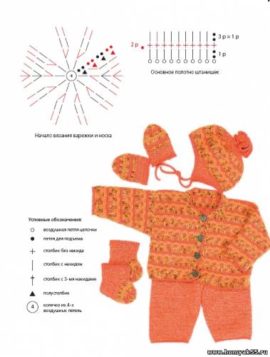 Великолепный оранжевый костюм для маленького ребенка до года, состоящий из шапочки, кофточки, штанишек и варежек.