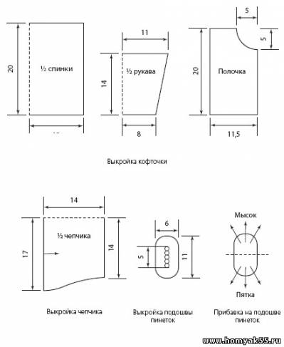 Начинайте чепчик от цепочки из ВП, проходящих по внешнему краю чепчика. Количество петель цепочки должно делиться на 4. Вяжите чепчик образцом основной вязки кофточки. В 6-ом и 7-ом, в 10-ом и в 11-ом рядах сделайте убавки по краям полотна. В 9-ом, 13-ом и 17-ом рядах сделайте вытачки столбиками разной высоты.Начинайте ряд 5 СБН, сделайте 5 прочных столбиков, и продолжайте вязание ССН. Заканчивая ряд, провяжите столбики в обратной последовательности. Отпарьте полотно и сделайте шов на затылке. Обвяжите чепчик по нижнему и по внешнему краю одним рядом из СБН. Сделайте отделочный ряд полустолбиками, чередуя их с ВП. На уголках в процессе обвязки сделайте завязки. Провяжите цепочку 20–25 см, вернитесь по ней полустолбиками.
