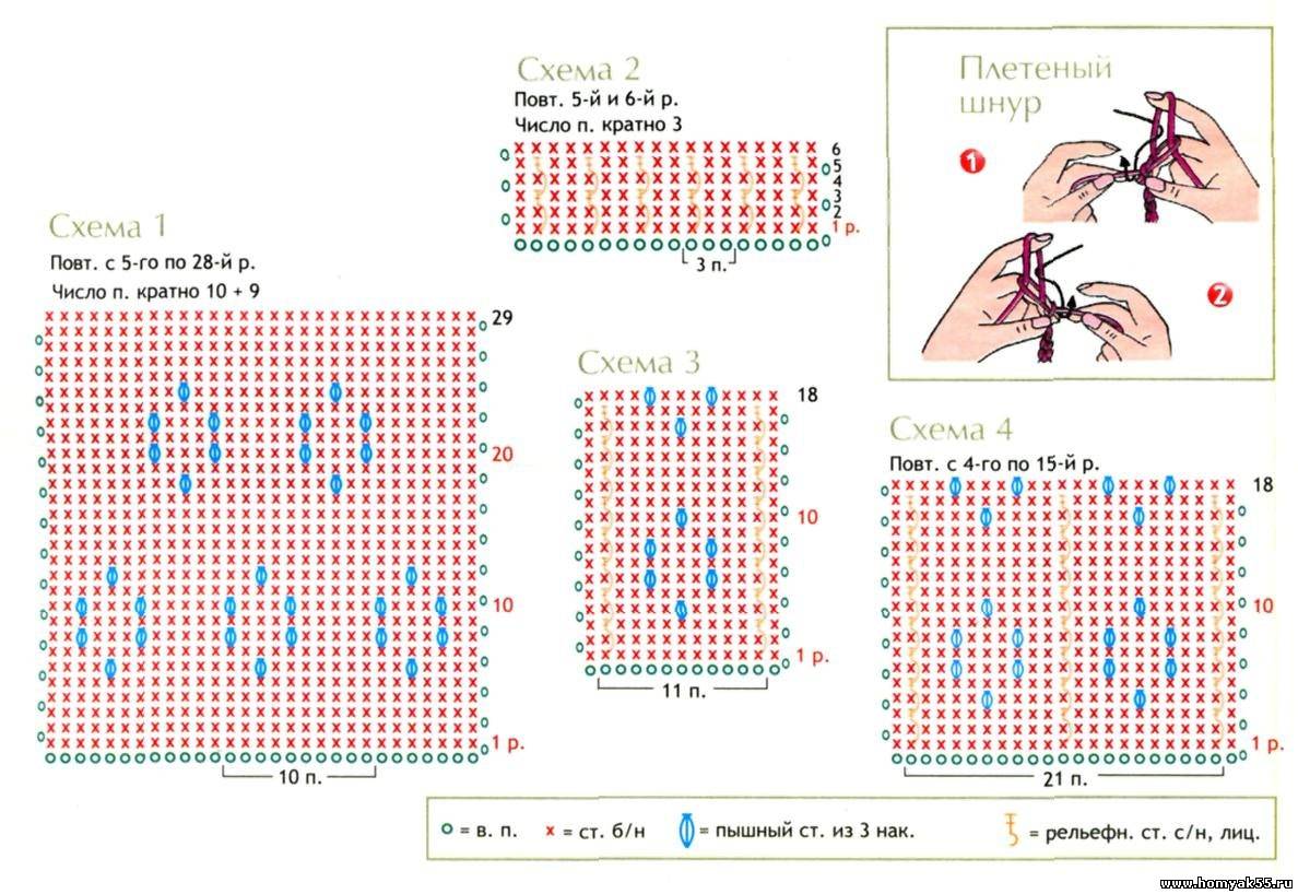 Набрать цепочку из 39 ВП, связать 10 рядов узором по схеме 2 и продолжить узором по схеме 1, прибавив с обеих сторон в каждом 6-м ряду 6 раз по 1 петле = 51 петля. На высоте около 19 см, учитывая, что должен быть связан 12-й или 24-й ряд схемы 1, закрыть с обеих сторон по 2 петли, убавив в каждом ряду, отступив по 2 петли от края, 3 раза по 1 петле = 41 петля. На общей высоте 20,5 см закончить вязание.