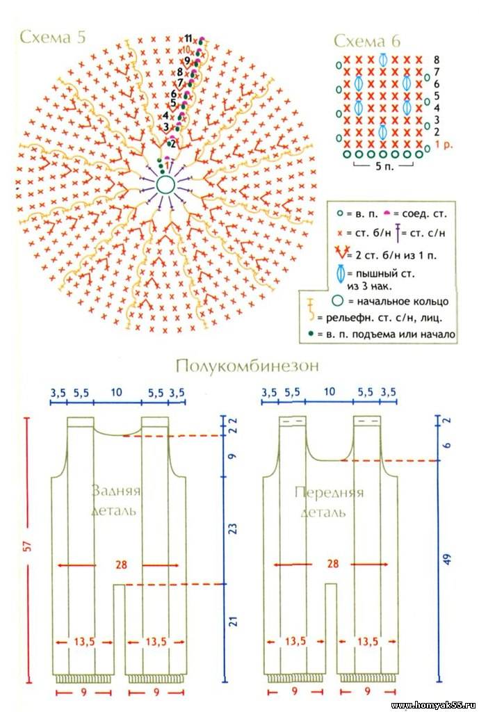 Начинать вязать со штанин. Для каждой штанины набрать цепочку из 24 ВП, связать 12 рядов по схеме 2, равномерно прибавив в последнем ряду 11 петель = 35 петель, и продолжить вязание первых и последних 12 петель СБН, а центральных 11 петель узором по схеме 3. На высоте 21 см объединить петли обеих штанин, набрав между ними цепочку из 3 ВП = 73 петли, и вязать прямо. На высоте 44 см от начала вязания закрыть для пройм с обеих сторон в каждом ряду 3 петли, 2 раза по 2 петли и 2 раза по 1 петле = 55 петель. Через 9 см от начала пройм закрыть для выреза горловины центральные 19 петель и по обе стороны от них в каждом ряду 3 раза по 1 петле. На высоте 55 см от начала вязания связать по 2 см СБН на каждом плече в качестве планок застежки и закончить вязание. Общая высота 57 см.