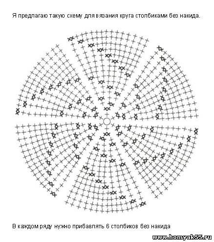 Сделать выкройку донышка шляпки: начертить на бумаге окружность диаметром 18 см. Синей нитью СБН связать круг, затем связать 3 см СБН для боковой части. Далее выполнить 7 рядов по схеме А. Обвязать белой нитью следующим образом: * 1 СБН, 3 ВП *, повторять от * до *. Продеть атласную ленточку.