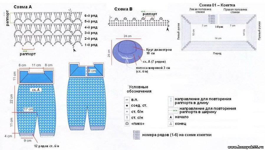 Вязать синей нитью круговыми рядами фантазийным узором по схеме А. На высоте 22 см от начала вязания отметить середину и каждую штанину вязать отдельно (еще 11 см). Обвязать низ штанины 12 рядами СБН. Сменить нить на белую и выполнить еще 2 ряда СБН. Вторую штанину вязать аналогично. На спинке для планок застежки выполнить с обеих сторон по 5 рядов СБН. Пришить 3 пуговицы на левую половинку спинки.