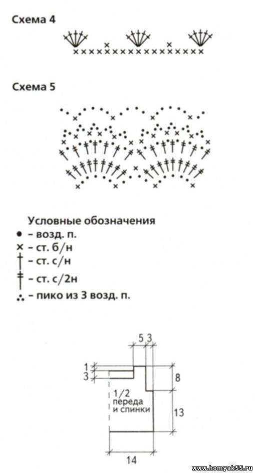 Выполните плечевые швы, оставив не сшитыми по 2 см с внутренней стороны. Выполните боковые швы. Обвяжите проймы и горловину 1 рядом СБН. Низ топа обвяжите по схеме 4. Пришейте карман и цветы, как показано на фото, украсьте середины цветов бусинами.
