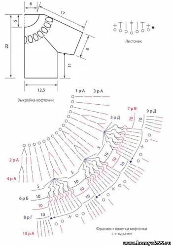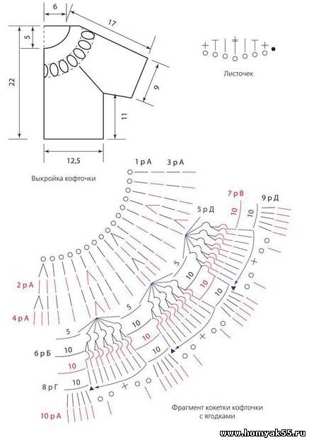 Вяжите кофточку сверху вниз столбиками с накидом (ССН) от цепочки из 80 ВП. Вяжите в прямом и обратном направлениях, предполагая застежку на спинке. Со 2-го по 4-й ряды делайте по девять прибавок в каждом ряду. В 4-м ряду получится сто 7 столбиков. Это соответствует кратности рисунка. Количество столбиков должно делиться на 5 + 2. В 5-м ряду вяжите по схеме «веерочки» нитью цвета «Б».$CUT$ Между «веерочками» делайте 10 ВП цепочки. Следующие 3 ряда образуют «ягодку», как в предыдущей модели. 6-й и 7-й ряды вяжите нитью цвета «В», а 8-й ряд нитью цвета «Г». Провяжите по схеме 1 ряд нитками цвета «Б».Продолжите вязание ССН с прибавками по 3 столбика в одну петлю по линиям реглана. Прибавки делайте до нужного размера. Довяжите полотно спинки, переда и рукава. Соедините кофточку по швам. На горловине спинки сделайте по 2 укороченных ряда. Обвяжите края кофточки 1 рядом из СБН с «пико» на каждом 2-м столбике. При обвязке вертикального края деталей спинки вместо «пико» сделайте навесные петли для пуговиц.