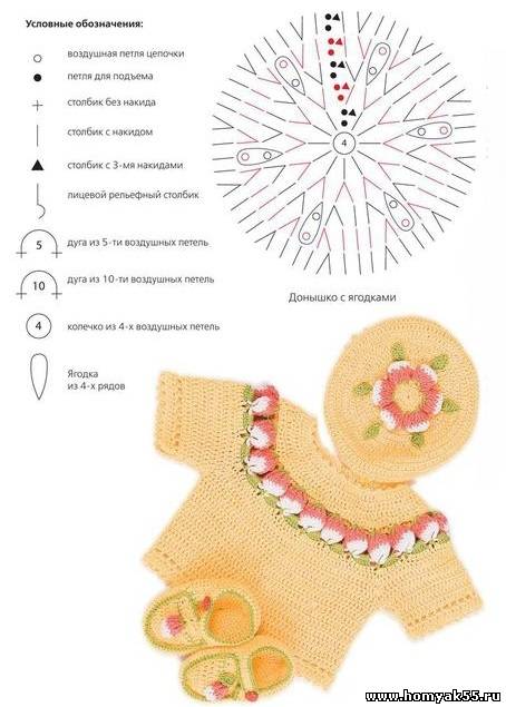 Бесподобный комплект для маленьких деток связан крючком. Ярко выглядит и обязательно понравится маленькому чуду. Узоры из ягод добавляют ему очарования. Удобные туфельки защитят ножки ребенка.