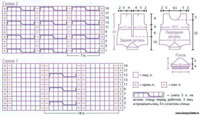 Узор «восьмёрки»: число петель кратно 7 + 6 + 2 кром. Вязать по схеме 2, на которой приведены лиц. ряды, изн. ряды вязать по рисунку. Вязать, повторяя с 1 -го по 6-й ряды. Петли для пуговиц: 2 петли вместе лиц., 1 накид. В изн. р.ядах накид вязать по рисунку.