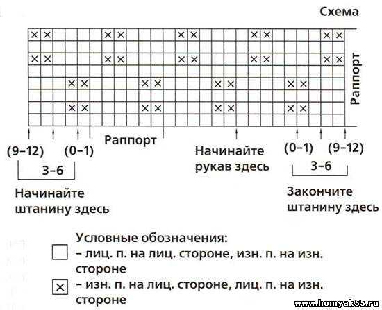 Основной узор: вяжите по схеме, кром. петли на схеме не указаны.