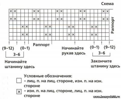 Начинайте работу с одной штанины. Наберите (66) 66 (70) петель на спицы № 2 и провяжите 3 см резинкой 2 x 2, при этом первая и последняя петли должны быть изн. В последнем ряду равномерно уменьшите количество петель до (56) 60 (64) петель. Поменяйте спицы на № 2,5 и вяжите основным узором. На высоте (10) 5 (5) см прибавьте по 1 петле с обеих сторон, повторяйте прибавления через каждые 5 см, пока в изделии не будет (60) 66 (72) петель.