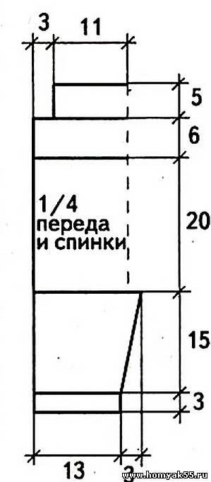 Наберите нитью голубого цвета 56 петель и провяжите резинкой 2 x 2 (попеременно 2 лиц. петли, 2 изн. петли) 3 см. Далее вяжите лиц. гладью. Провяжите белой нитью 2 ряда, затем перейдите на голубую нить и провяжите 38 рядов лиц. гладью, прибавляя с обеих сторон 6 раз х 1 петле. На высоте 15 см от резинки свяжите шаговое закругление, убавляя с обеих сторон 1 раз х 3 петли, 1 раз х 2 петли, 1 раз х 1 петлю. Оставьте левую часть на спицах.Аналогично свяжите правую часть, затем обе части наденьте на одну спицу и соедините их, провязав 1 кром. петлю левой части и 1 кром. петлю правой части вместе лиц., затем вяжите лиц. гладью. Через 38 см от наборного края вяжите: лиц. гладью 2 ряда белой нитью, 2 ряда голубой нитью, 2 ряда белой нитью. Затем вяжите резинкой: 6 рядов голубой нитью, 2 ряда белой нитью, 16 рядов голубой нитью. Через 44 см от наборного края закройте 69 петель, оставьте центральные 44 петли для грудки. Через 49 см от начала все петли закройте.