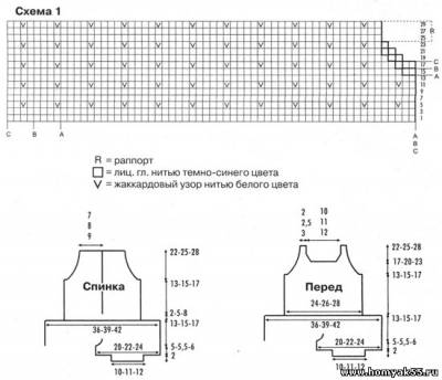 Вязать, начиная с левой штанины. На спицы № 2 набрать 26 (28; 30) петель нитью темно-синего цвета и вязать резинкой 2 x 2, начиная 3 (2; 3) лиц. петель и заканчивая 3 (2; 3) изн. петлями. На высоте 2 см от начала работы перенести все петли на спицы № 3 и вязать жаккардовым узором по схеме 1, одновременно прибавив в 1-м лиц. ряду 26 (28; 30) петель, провязывая из каждой петли по 2 лиц. петли = 52 (56; 60) петли.Внимание: после выполнения прибавок начинать и заканчивать вязание с петель, помеченной на схеме буквой А (В; С). На высоте 5 (5,5; 6) см от начала работы снять петли на вспом. спицу. Правую штанину вязать симметрично левой. Объединить петли обеих штанин = 104 (112; 120) петли и далее вязать на всех петлях жаккардовым узором по схеме 1.