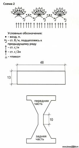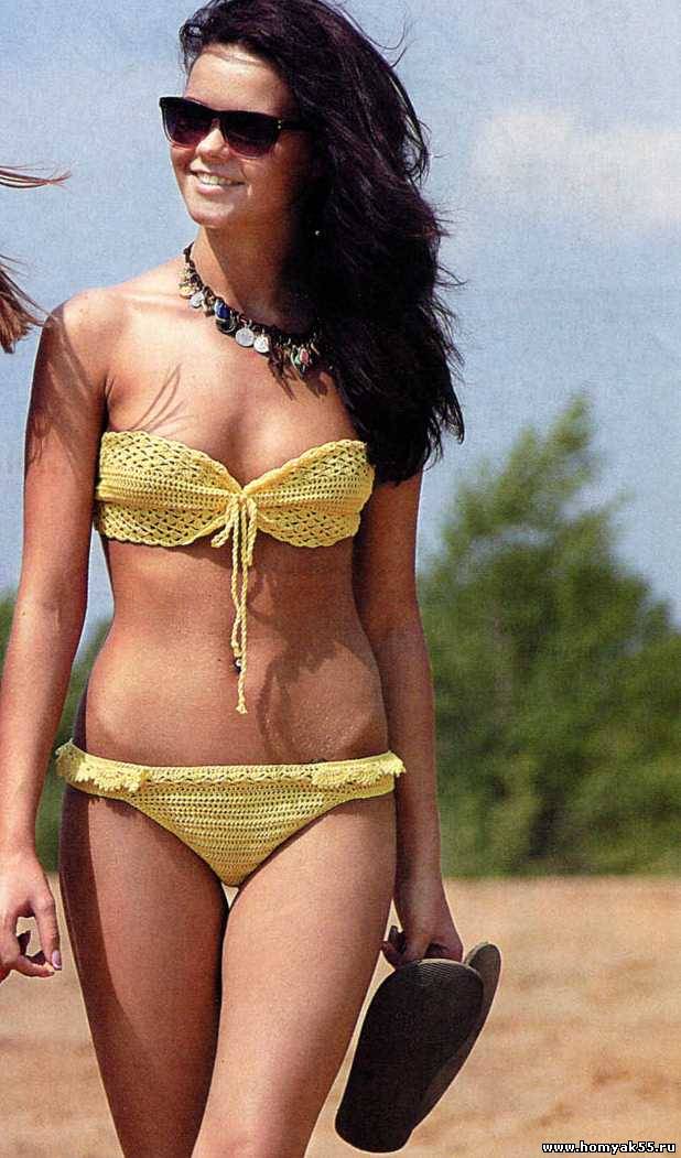 Наберите цепочку из ВП длиной см, вяжите 7 рядов ССН. Далее вяжите 5 рядов узором по схеме 1. Затем вернитесь к начальной цепочке и вяжите в другую сторону 5 рядов узором по схеме 1. Боковые части обвяжите 1 рядом СБН, 1 рядом филейной сетки (*ССН, ВП, 1 петлю основания пропустите*, повторяйте *-*) и еще 1 рядом СБН. В получившиеся отверстия вставьте шнурочки из ВП. Середину лифа стяните шнурочком, как показано на фото.Бикини