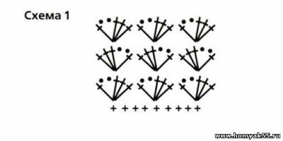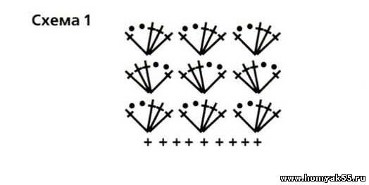Обвяжите верхний край по кругу 1 рядом ССН, 2 рядами узором по схеме 1, еще 1 рядом ССН и 1 рядом СБН. Для рюша вяжите 11 арочек из 5 ВП, прикрепляя их к ССН в каждый 4-й столбик. Вяжите по схеме 2. Нижние края обвяжите 2 рядами СБН.Журнал "Всё из одного клубка"