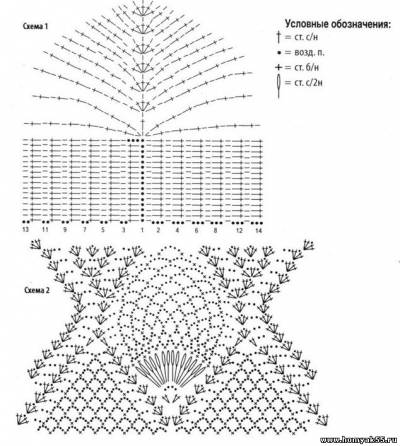 Наберите 18 ВП, работу поверните, 16 ССН, работу поверните, 3 ВП подъема, далее вяжите по схеме 1. Связанные чашечки соедините в центре, нижний край обвяжите 1 рядом полустолбиков, затем свяжите цепочку из ВП длиной 50 см = правая завязочка. Работу поверните, ряд из ВП провяжите полустолбиками, затем провяжите 2-й ряд полустолбиками по нижнему краю чашечек и свяжите цепочку из ВП длиной 50 см = левая завязочка. Работу поверните, провяжите 1 -й ряд полустолбики, затем 3-й ряд полустолбики по нижнему краю чашечек.Плавки
