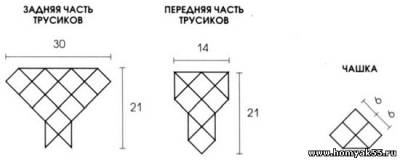 Задняя часть трусиков состоит из 10 мотивов и 5 полумотивов, соединённых посредством арок последнего ряда, как показано на схеме.Передняя часть трусиков состоит из 5 мотивов и 6 полумотивов, соединенных посредством арок последнего ряда, как показано на схеме.