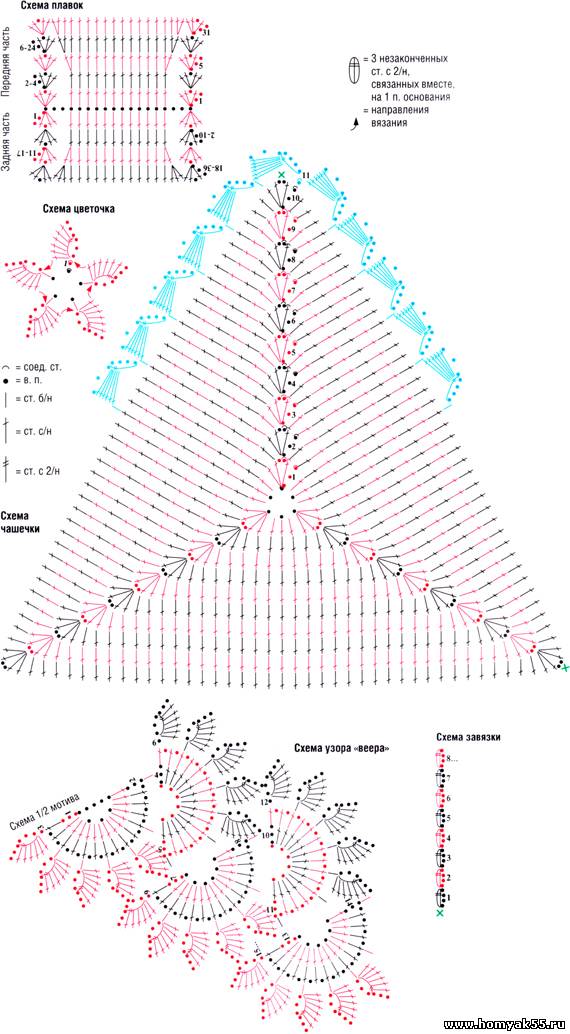 Присоединить новую нить (на схеме место присоединения указано зелёным крестиком) и вязать до необходимой длины согласно схеме завязки. Выполнить 2 цветка согласно схеме и пришить по центру чашечек согласно фото.Плавки
