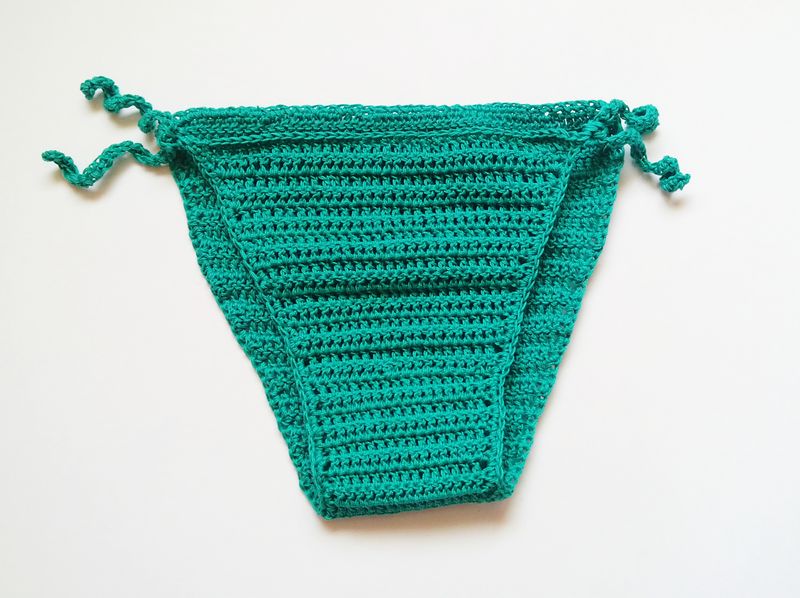 Передняя часть низа купальника может быть немного меньше задней, так как она не выпуклая. Обвязываем плавки столбиками без накида и вяжем по бокам с 4 сторон завязки, как вязали на лифе. Только здесь делаем 20-25 петелек. Последний ряд также вяжем, прокладывая эластичную нить.