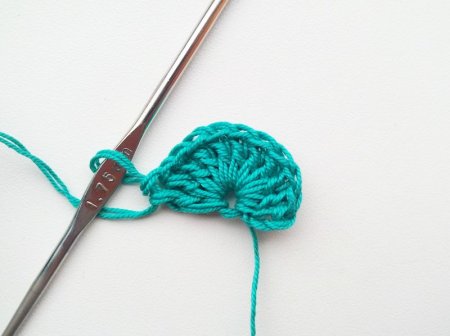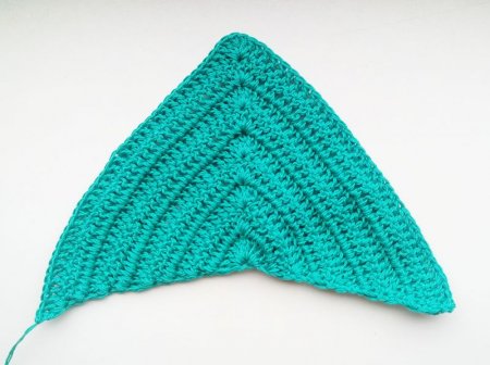 Теперь разворачиваем вязание и провязываем в первый столбик 3 столбика с накидом. Вяжем далее 4 столбика с накидом. В следующий столбик вяжем 5 столбиков с накидом, далее вновь провязываем 4 столбика с накидом и в последний столбик выполняем 3 столбика.