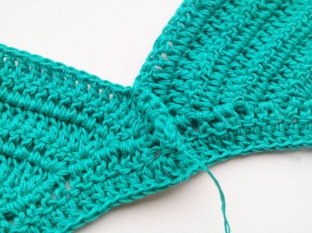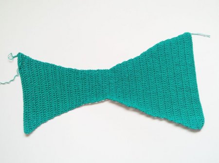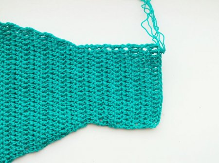 Набираем петли по ширине бедер. И вяжем ряд столбиками с накидом. В следующем ряду делаем по бокам по 1 убавке. То есть просто вяжем первые 2 столбика вместе и последние 2 тоже вяжем вместе. Далее вяжем ряд без убавок. И затем повторяем ряд с убавками и так далее. Оставляем 18-20 петелек.