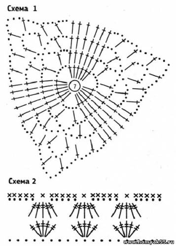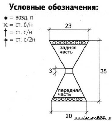 Перед началом работы выполните выкройку в натуральную величину. Наберите 13 ВП и вяжите СС, начиная от середины, сначала переднюю часть высотой 17 рядов, выполняя прибавления в соответствии с выкройкой. Затем свяжите среднюю часть 4 ряда прямо и заднюю часть 20 рядов, выполняя прибавления в каждом крайнем столбике с обеих сторон в соответствии с выкройкой. Верхние края передней и задней части обвяжите ажурной каймой по схеме 2. Затем обвяжите всю деталь по периметру СБН. Обвяжите 4 колечка СБН красной нитью, пришейте их по бокам плавок. Для завязок скрутите 2 шнурка и проденьте их сквозь колечки. $CUT$Журнал "Копилка вязаных идей для детей", 2012