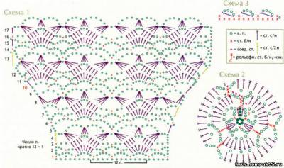 Выполнить плечевые и боковые швы. Обвязать крючком вырез горловины и проймы отделкой по схеме вязания 3, выполняя 1-й ряд нитью цвета слоновой кости и 2-й ряда нитью лилового цвета. Пришить большие цветочки на нижней детали переда кофточки, связанной крючком, а маленькие цветочки пришить на левом плече кофточки.