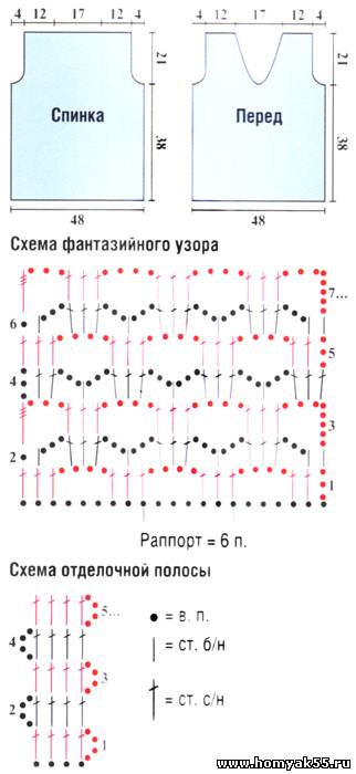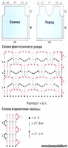 Далее вязать согласно схеме фантазийного узора по 39-й ряд включительно. Для оформления линии пройм в 40-м ряду от начала вязания оставить непровязанными с обеих сторон по 1/2 раппорта. В работе находится 20 раппортов. Для оформления линии выреза переда с 42-го ряда от начала вязания оставить непро-вязанными 2 средних раппорта и с обеих сторон от них в каждом ряду 19 раз по 2 петли. В работе 7 раппортов. В 60-м ряду от начала вязания работу закончить. Нить отрезать.