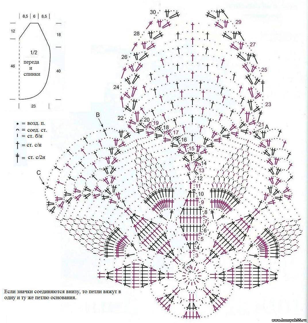 Связать цепочку из 10 ВП и замкнуть в кольцо 1 СС. Вязать по схеме = 8 мотивов. Каждый круг. ряд начинать с указанного числа ВП вместо 1 петли и заканчивать 1 СС в последнюю ВП подъема. При необходимости СС связать в начале след. круг. ряда. Закончить через 20 круг. рядов. На правой стороне верхней спинки присоединиться к стрелке А и обвязать 1-й мотив с 21-го по 30-й ряды, как показано, после этого закончить.Также обвязать с левой верхней стороны спинки 2-й мотив. Следующие 12 петель (на схеме до стрелки В) образуют нижний край левой проймы.$CUT$ Остальная часть этого мотива и след. мотив до стрелки С образуют левый бок. Оставшаяся часть этого мотива, след. 2 мотива и далее мотив до стрелки В создадут нижний край спинки. Оставшаяся часть мотива и след. мотив до стрелки С образуют правый бок. А оставшаяся часть этого мотива - нижний край правой проймы.