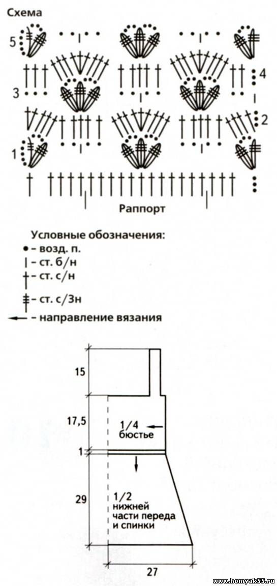 Внимание! Сначала свяжите целиком лиф в поперечном направлении. Затем свяжите бретели и нижнюю часть. Стрелки на выкройке - направление вязания.