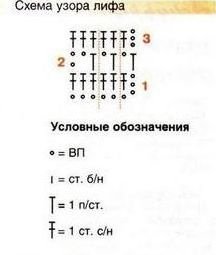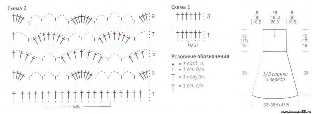 Связать цепочку из 71 (81) 91 ВП + 3 ВП подъёма и вязать основным узором. Через 15 (17) 19 см от наборного края связать 1 изн. ряд СБН (этот ряд обозначен под схемой 2 в виде точек). Затем вязать 30 см веерным узором (закончить 5-м или 8-м рядом узора).Сборка