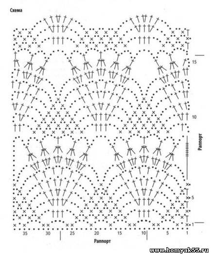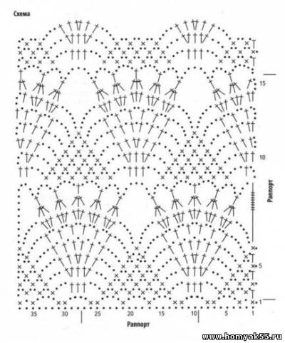 Вяжите сверху вниз. Наберите 126 ВП, вяжите ажурным узором по схеме. На высоте 51 см закончите работу.Перед