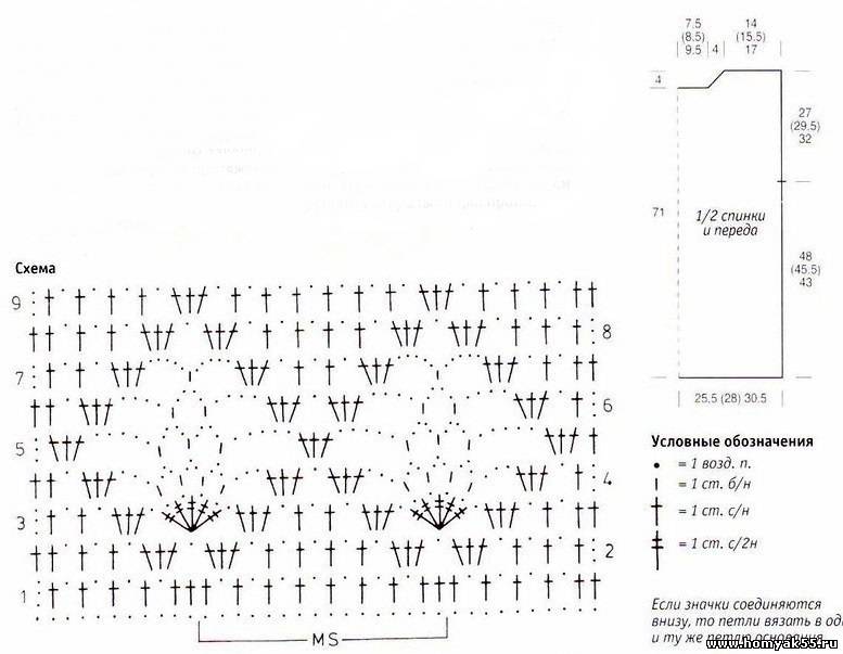Внимание! Сделайте выкройку в натуральную величину и, прикладывая к ней работу, выполняйте убавления для выреза горловины. $CUT$