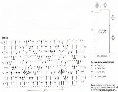 Выполнить плечевые швы. Обвязать вырез горловины крючком № 4 по 1 круговому ряду СБН и "рачьего шага" (= СБН слева направо). Выполнить боковые швы, при этом верхние 27 (29,5) 32 см оставить открытыми для пройм.Журнал "Сабрина"
