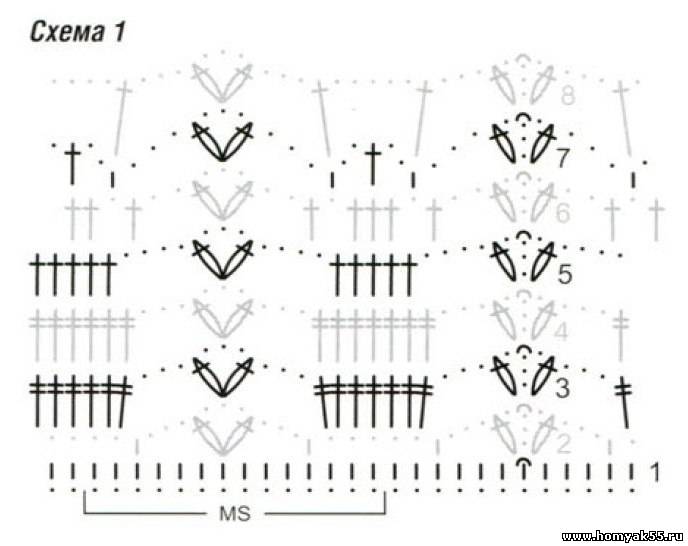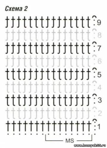 Шахматный узор: число петель кратно 8 + 3 ВП подъёма. Вязать, как основной узор, но по схеме 2. Выполнить 1 раз с 1-го по 9-й ряды, затем повторять со 2-го по 9-й ряды.