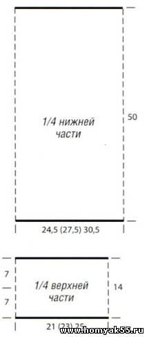 Связать цепочку из 168 (184) 200 ВП, сомкнуть её в кольцо и вязать шахматным узором. Через 7 см от наборного края для разреза разделить работу пополам и вязать прямыми и обратными рядами. Через 14 см от наборного края работу закончить.