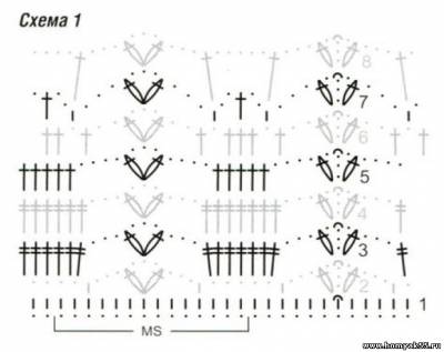 Основной узор: число петель кратно 14. Вязать круговыми рядами по схеме 1. Начинать с петель перед раппортом, повторять петли раппорта, заканчивать петлями после раппорта. Выполнить 1 раз с 1-го по 8-й ряды, затем повторять с 3-го по 8-й ряды.